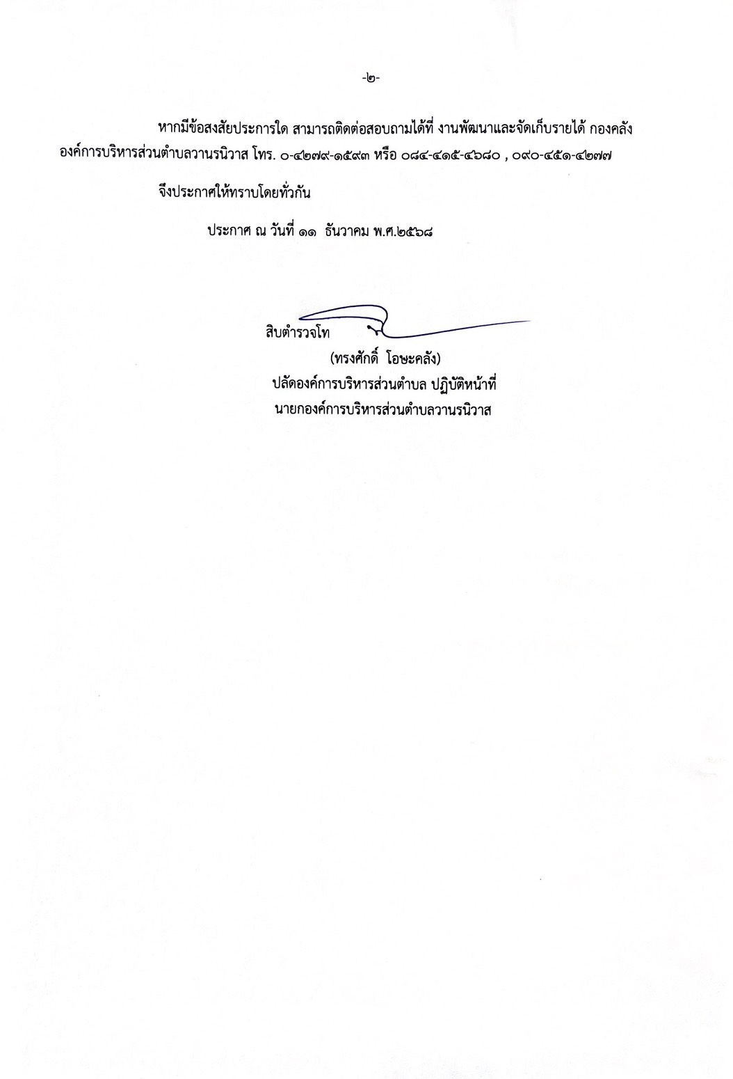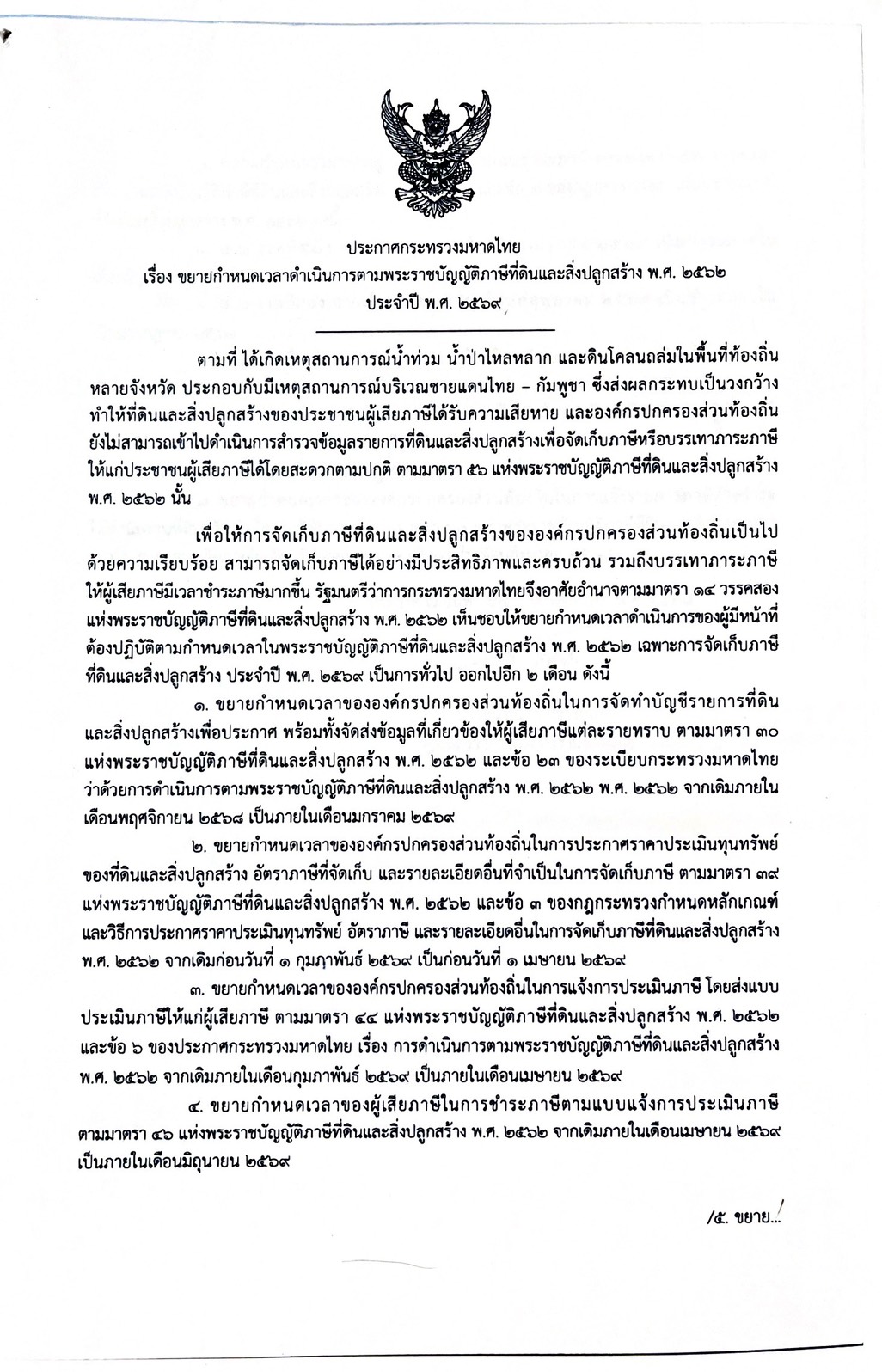 ขยายกำหนดเวลาดำเนินการจัดเก็บภาษี ตามพระราชบัญญัติภาษีที่ดินและสิ่งปลูกสร้าง พ.ศ.2562 ประจำปีงบประมาณ 2569