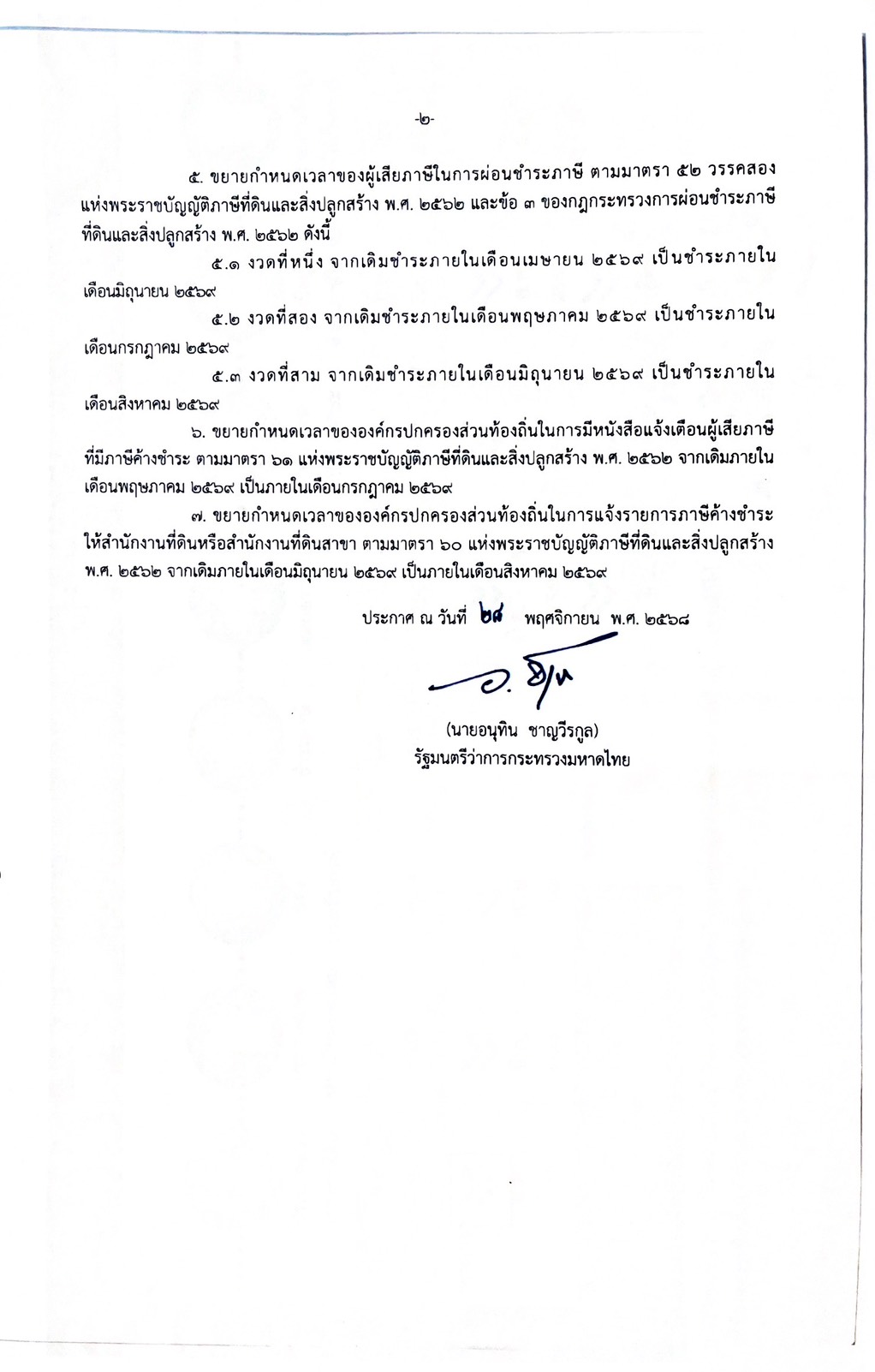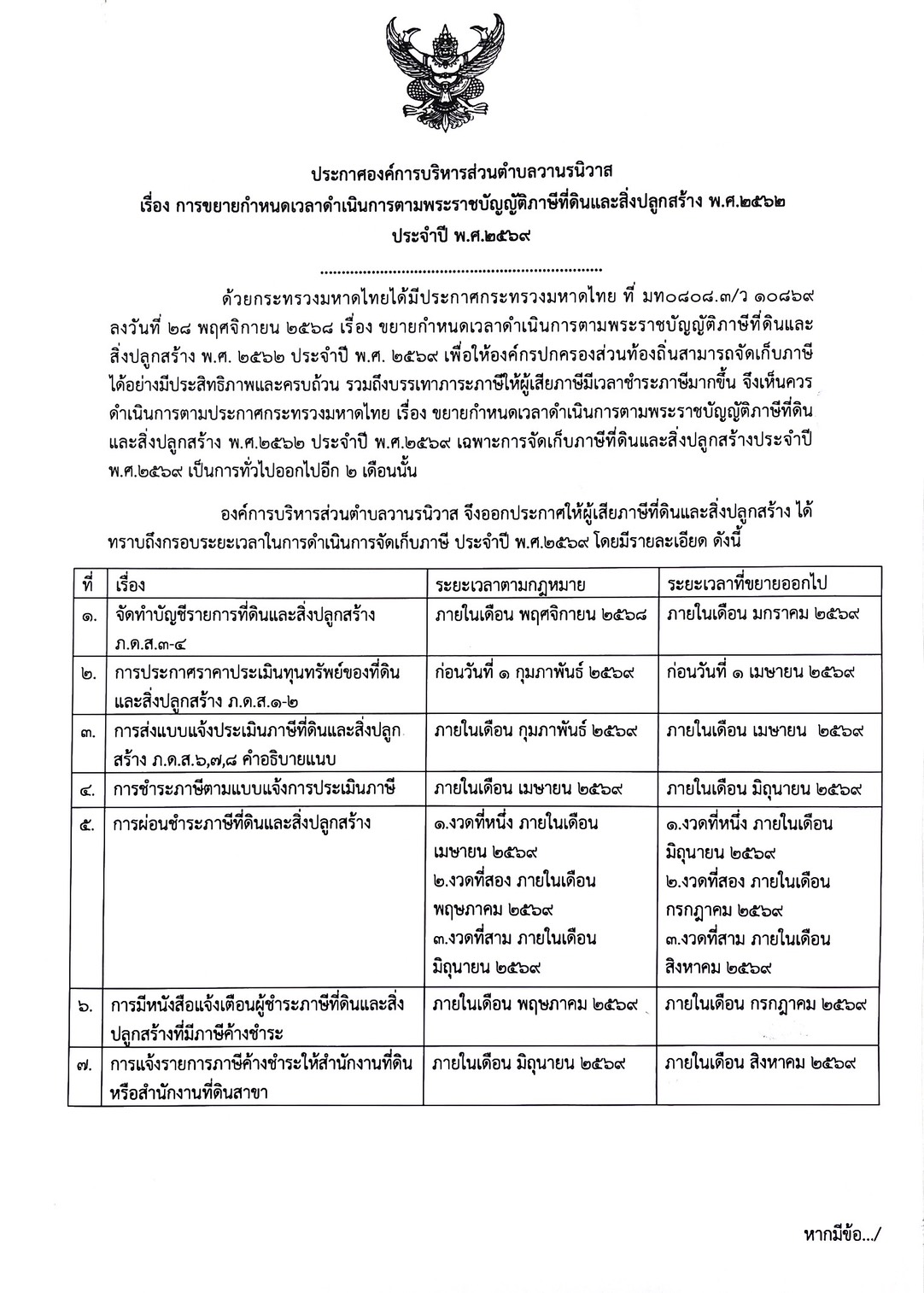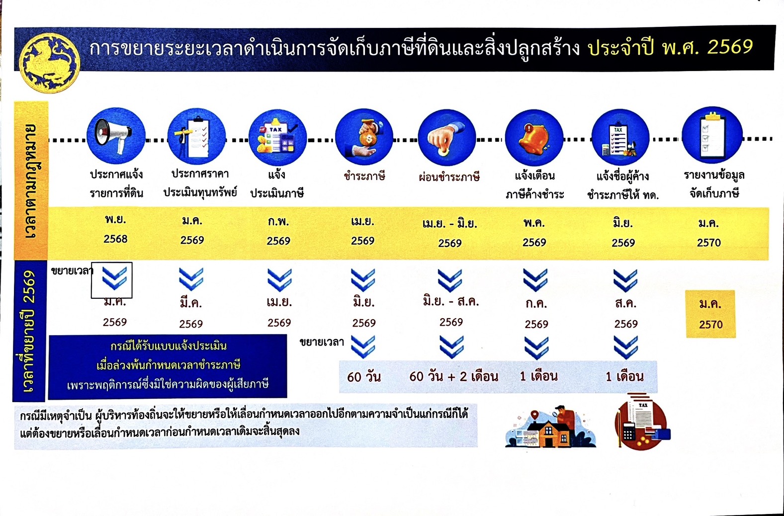 ขยายกำหนดเวลาดำเนินการจัดเก็บภาษี ตามพระราชบัญญัติภาษีที่ดินและสิ่งปลูกสร้าง พ.ศ.2562 ประจำปีงบประมาณ 2569